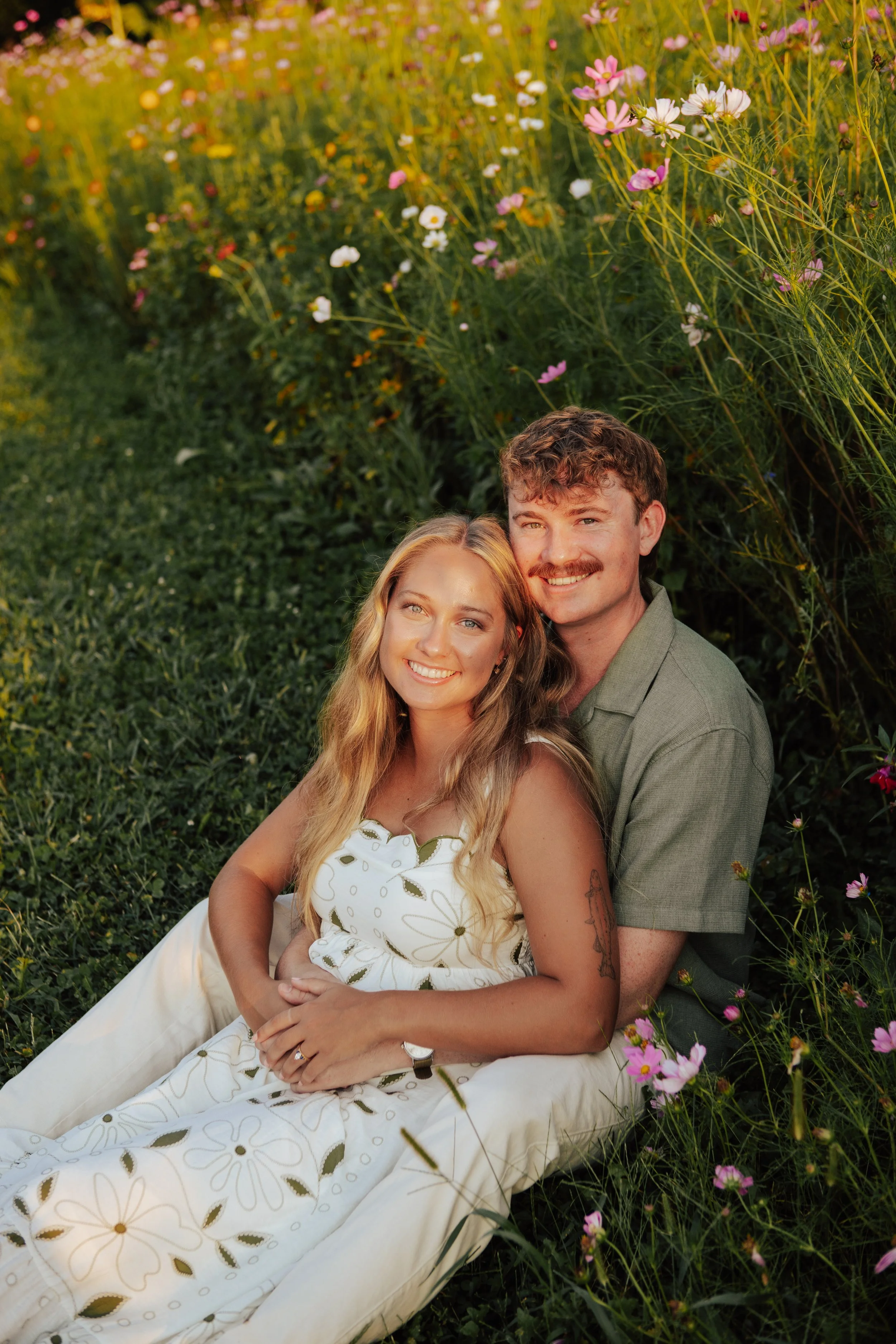 The ring itself tells a story just as meaningful as the proposal. Designed with the help of the team at Smith’s Jewelers, the piece blends personal details that reflect both of their lives and families. Savannah chose a marquise diamond for the center stone, flanked by blue sapphires — her favorite color — adding a vibrant pop of meaning. Along the sides, delicate western-style engravings add texture and personality, while four Mariposa lily flowers feature citrine and peridot center stones chosen to represent elements of their family heritage.